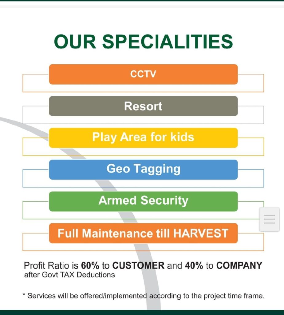 Resort & hotel facility inside the project | Geo-tagging for every plot | Full maintenance till harvest (17 years)